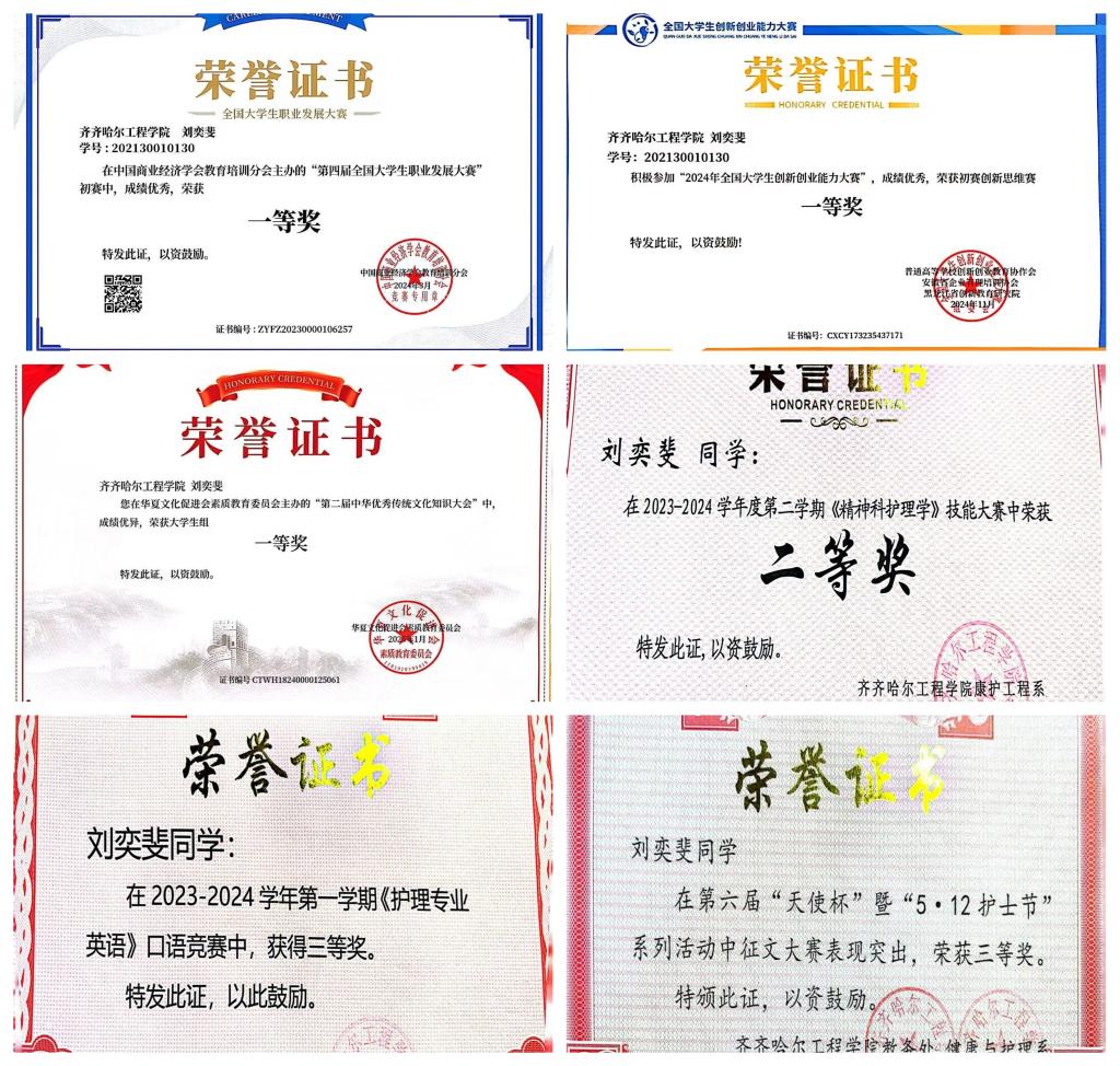 刘奕斐在校期间,积极参加院系组织的各项竞赛,在学校举办的第一届实验室安全知识竞赛获二等奖、“展护士魅力,秀护士智慧”专业知识竞赛获二等奖、“外科全能挑战赛”主题竞赛获二等奖、2022年学校组织的“我的第三学期”主题微视频作品征集大赛获三等奖、第六届“天使杯”暨“5·12护士节”系列活动征文大赛获三等奖等荣誉。