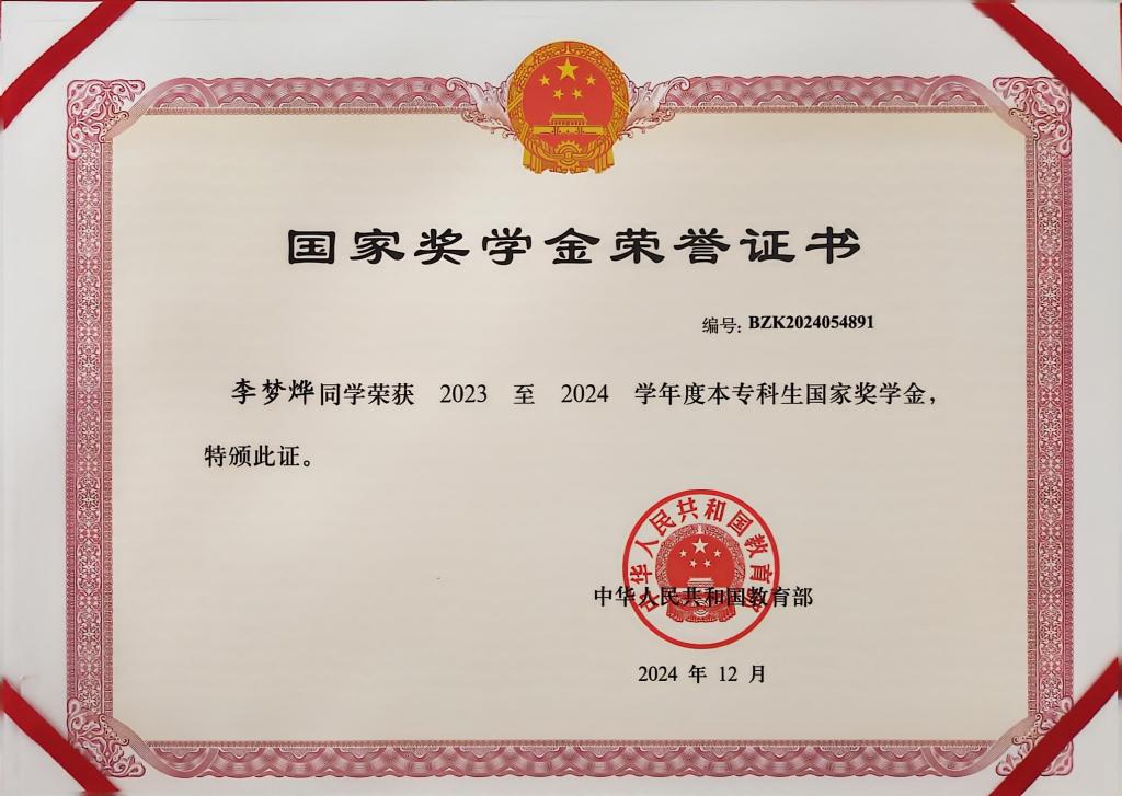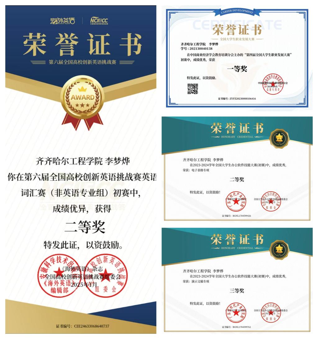 在专业学习上,李梦烨以“勤奋学习,勇于探索”的态度严格要求自己。她五次获得学校一等奖学金,在专业课程上始终保持领先。同时,她还考取了大学英语四级证书和国家计算机等级考试MS Office二级证书。