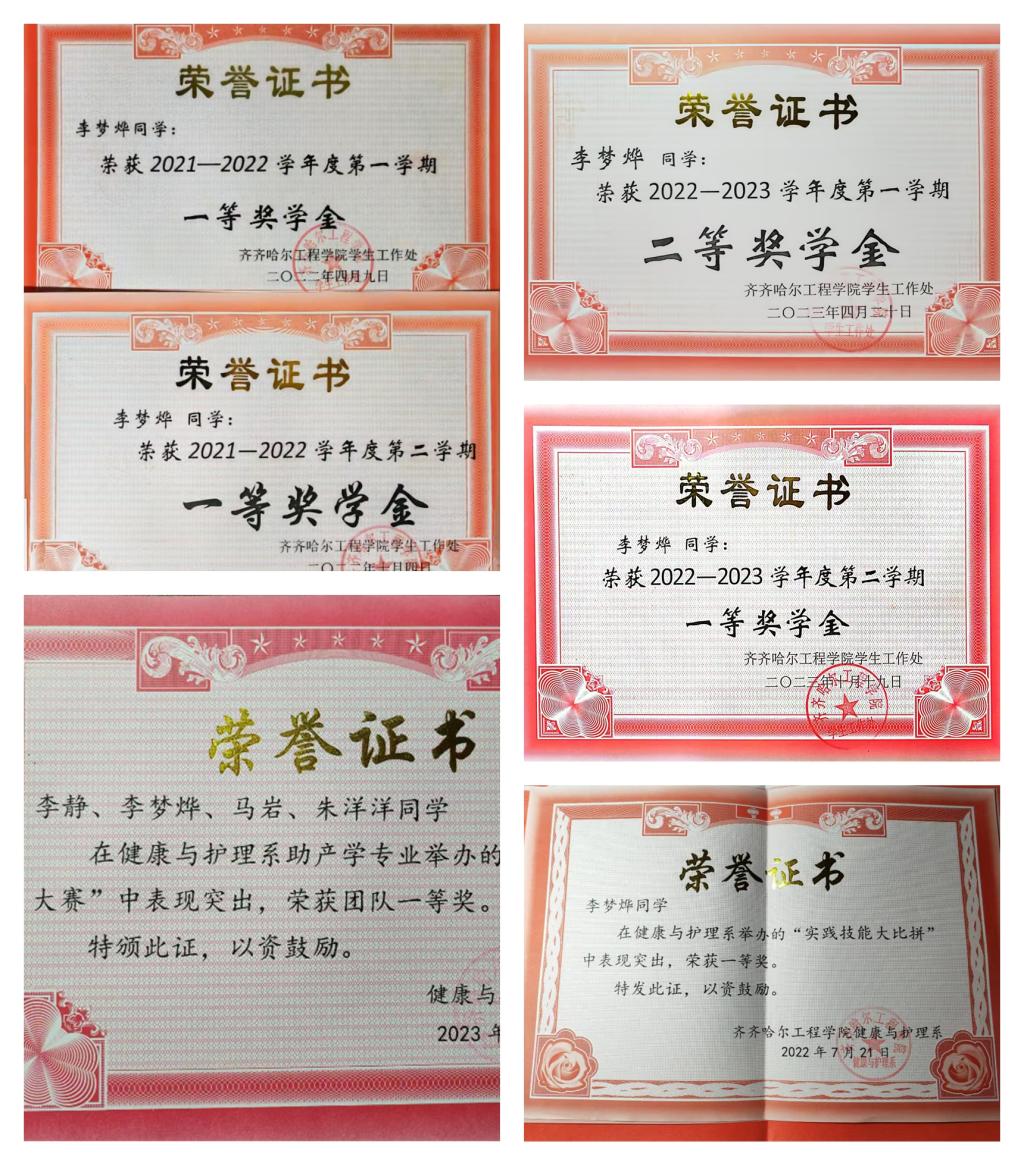 李梦烨在中国人民解放军空军特色医学中心实习期间,她在中西医结合正骨科表现出色,获得教学查房三等奖,并被评为“空军特色医学中心优秀实习生”、在齐齐哈尔医学院附属第二医院的实习同样获得认可,被评为“齐齐哈尔医学院附属第二医院优秀实习生”。这些实践经历让她将理论知识与临床技能完美结合。