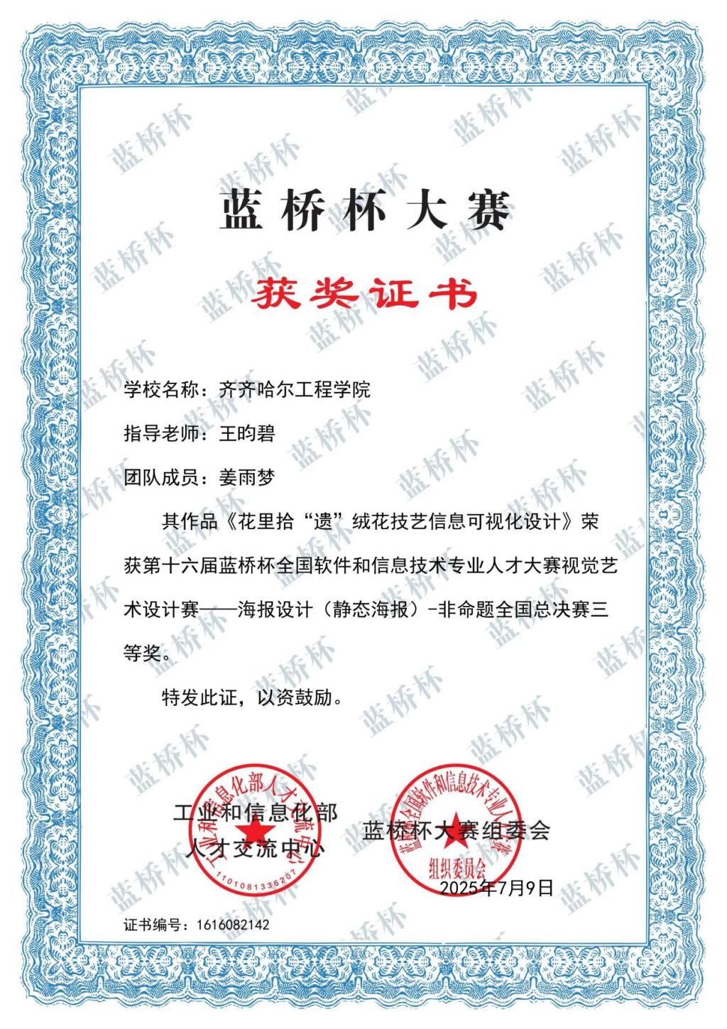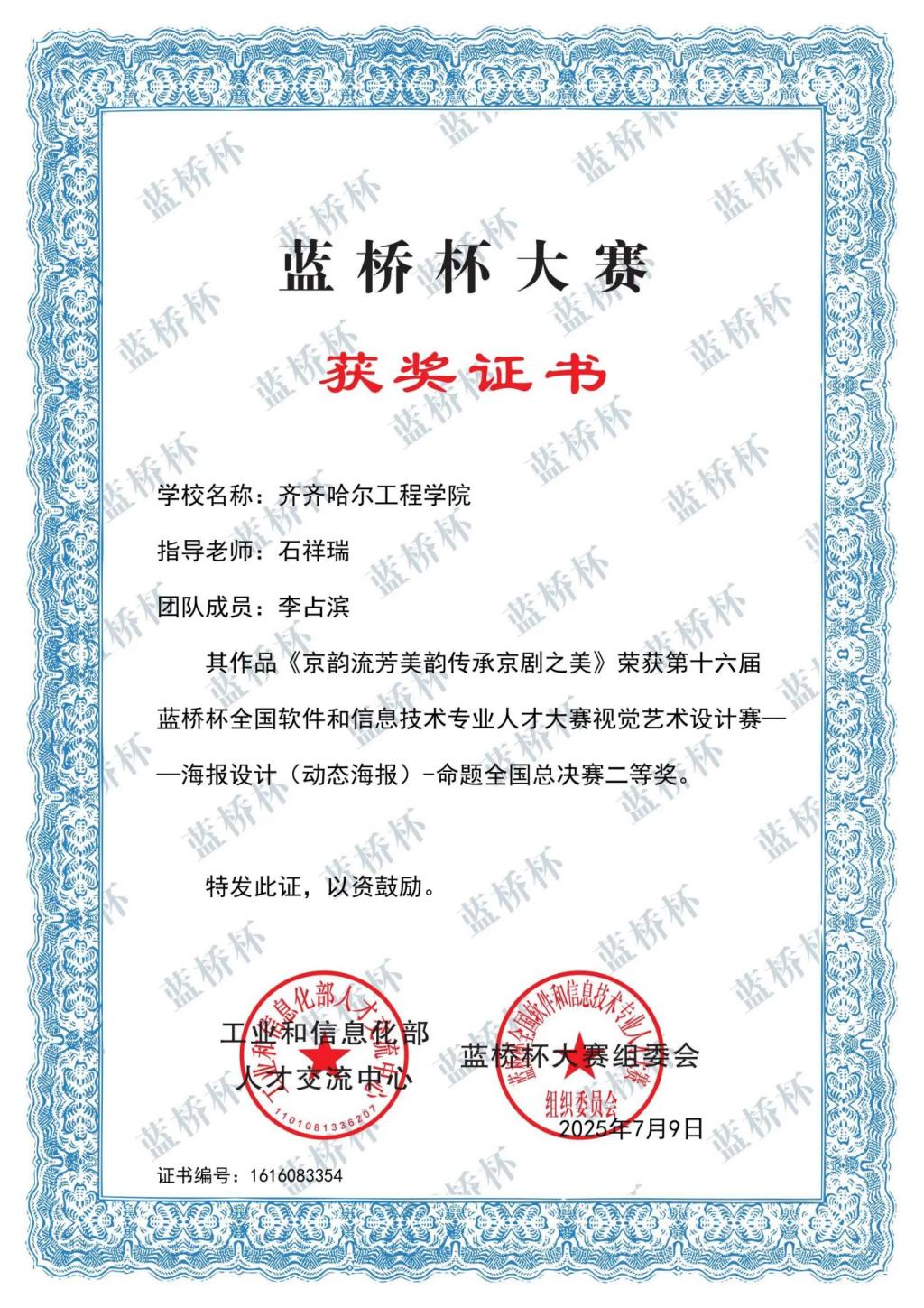 近日,第十六届蓝桥杯大赛圆满落幕,齐齐哈尔工学院艺术与体育学院视觉传达设计专业师生团队凭借出色的创意设计与专业实力,在赛事中脱颖而出,荣获多项大奖。其中,学生李占滨斩获国家二等奖、省级一等奖,姜雨梦荣获国家三等奖、省级一等奖,周怡等五人获省级二等奖,胡朕等五人获省级三等奖,韩俐君等三人获优秀奖,充分展现了学院在艺术设计领域的人才培养成果。