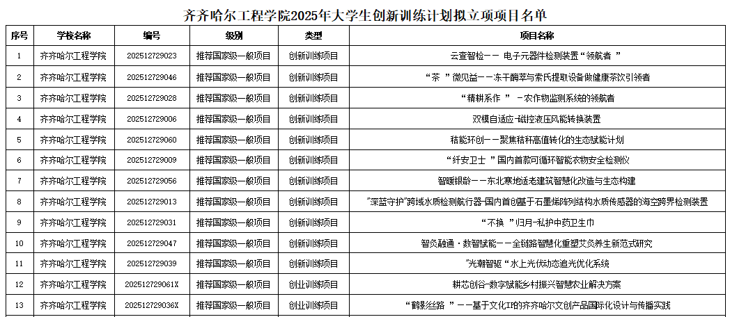 从去年64项立项到今年全申报全立项,从9项国家级项目到13项国家级项目,数字背后是学校创新创业教育体系的持续完善。此次大创项目的优异成绩,不仅彰显了学校人才培养质量的提升,更成为推动应用型人才培养改革的重要引擎。下一步,创业学院将深化创新创业教育改革,大力聚焦项目成果转化,力争国家级项目实现再增长,培育一批具有市场竞争力的学生创业项目,为区域经济发展培养更多具备创新精神和创新创业能力的高素质人才,为黑龙江省创新创业教育发展贡献“齐工程力量”。