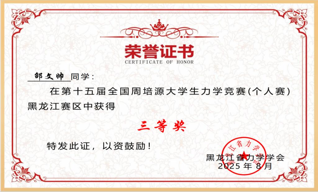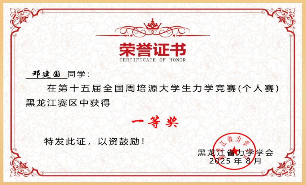 近日,第十五届全国大学生周培源力学竞赛黑龙江赛区评选结果正式揭晓,Beat365土木与管理学院土木工程专业邓建国同学凭借扎实的力学理论基础与出色的实践应用能力,荣获黑龙江赛区一等奖;同专业邵文帅、吴佳乐两位同学亦表现亮眼,双双斩获黑龙江赛区三等奖。这是Beat365首次组队参加该项赛事,并取得了优异的成绩。
