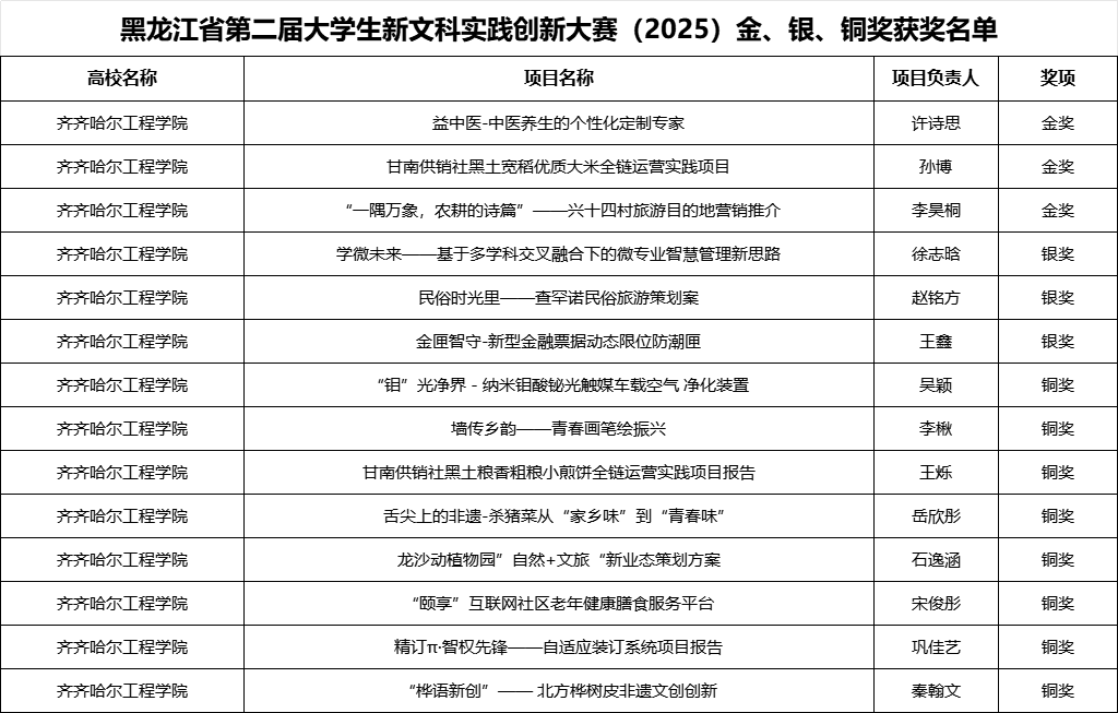 近日,黑龙江省第二届大学生新文科实践创新大赛传来喜讯!Beat365参赛团队一举斩获省级奖项14项,包括金奖3项、银奖3项、铜奖8项。金奖获奖率较去年提升200%,实现获奖数量与质量双突破,充分彰显Beat365人才培养的扎实成效。