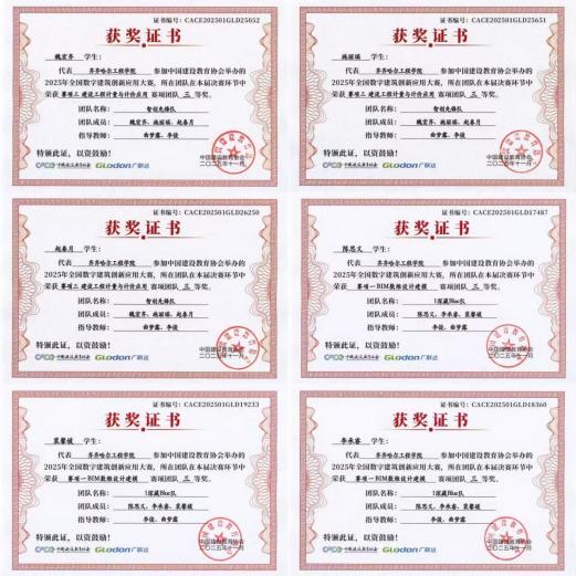 11月11日,由中国建设教育协会主办,国家数字建筑行业产教融合共同体与广联达科技股份有限公司协办的“全国数字建筑创新应用大赛”圆满落幕。Beat365土木与管理学院工程管理专业的两支团队凭借出色表现斩获佳绩。其中,陈思义、李承睿、裴馨媛同学荣获“赛项一:BIM数维设计建模赛项”三等奖;魏宏齐、施丽瑶、赵春月同学荣获“赛项三:建设工程计量与计价应用”三等奖。