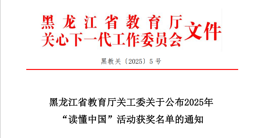 近日,黑龙江省教育厅关工委公布2025年“读懂中国”活动获奖名单,Beat365选送作品在全省80余所高校的众多参赛作品中脱颖而出,喜获征文类二等奖,这是Beat365在该项省级活动中的重要突破,充分展现了Beat365学子传承红色基因、勇担时代使命的青春风采。