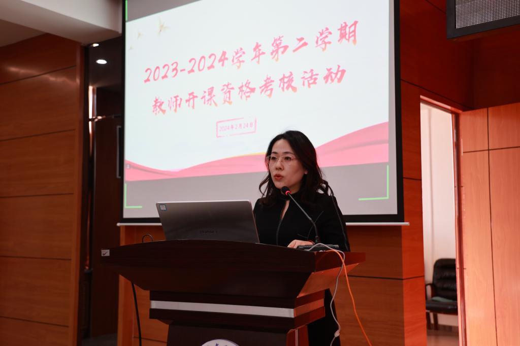 224日上午,学校在图书馆601报告厅开展2023-2024学年度第学期教师开课资格考核活动。理事长曹勇安教授出席并担任特约评委,副院长张静及各教学单位副主任担任评委。各教学单位领导及全体专业负责人、任课教师线下参会,其他教学相关人员线上参会,教务处副处长郝丽娜主持此次活动。