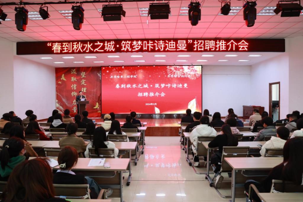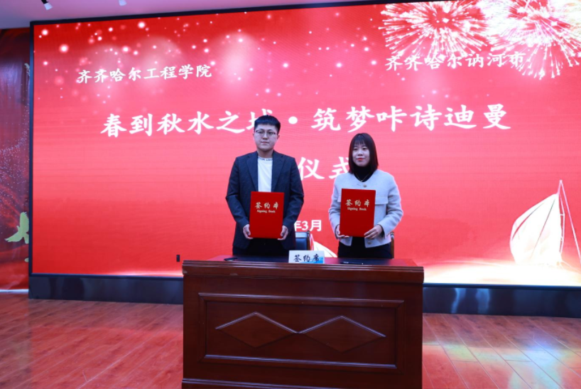 3月20日上午,由学生发展中心主办、管理工程系承办的“春到秋水之城·筑梦咔诗迪曼”招聘推介会在二号教学区2508室召开。会上,管理工程系与黑龙江咔诗迪曼集团投资有限公司举行校企合作签约仪式。讷河市委常委、组织部长刘涛,讷河市委组织部常务副部长刘建梅,黑龙江省咔诗迪曼集团投资有限公司总经理武腾龙,党委书记郭伟东、常务副院长陈景鑫,管理工程系主任徐明以及学校、讷河市相关部门负责同志出席活动。签约仪式由学生发展中心郭明敬老师主持,管理工程系教师及学生代表参加。