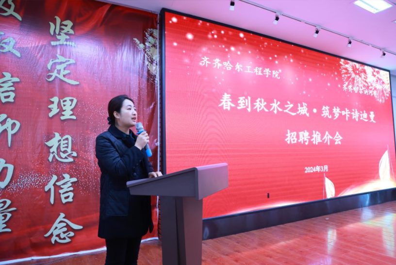招聘推介会上,陈景鑫代表学校对讷河市委常委、黑龙江省咔诗迪曼集团投资有限公司领导们的到来表示热烈欢迎,介绍了学校创校33年来,始终坚持“政校企合作、产学研融合、教学做合一”的人才培养模式,同时聚焦课程改革,探索“四真三化(FT)”课程建设,以课程为抓手,加强内涵建设,为地方经济发展培养高质量人才。