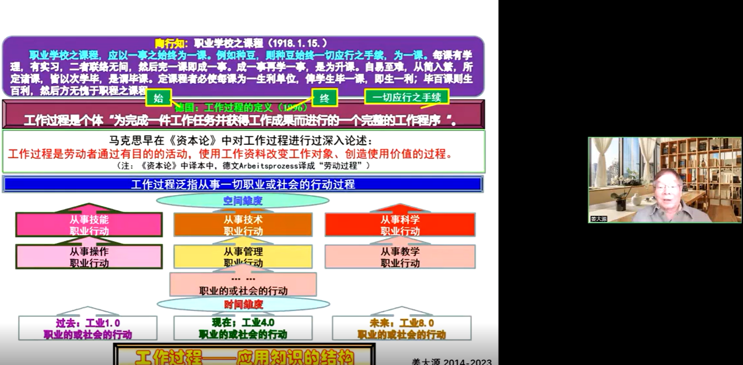 姜大源教授的讲座以《课程开发的关键——结构问题》为题,着重讲解了结构问题是课程开发的关键要素,以及依照产教融合要求进行课点重组进而引起教育功能的变化等问题。明确提出课程开发最重要的是解决课程内容如何选择和如何排序两个问题。