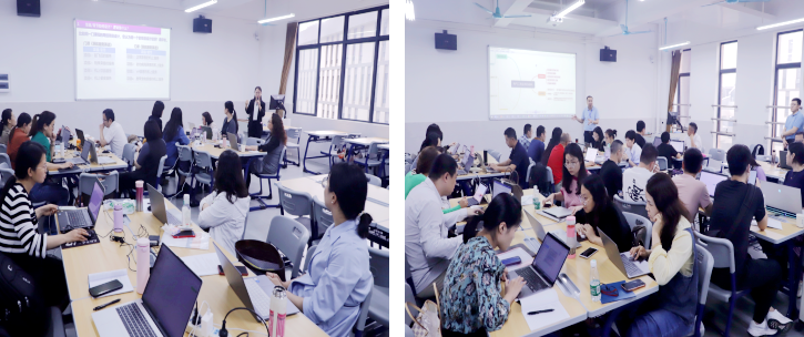 集中精讲结束后,以团队形式开展分班研修。期间,坚持“小步伐、高频率、快反馈”的教学方法,体现“讲练结合、精讲多练、突出精讲、贵在多练”的教学特点,“手把手”指导学员课程开发与实践,让学员们在“做中学、学中做、学会做、学做合一”。