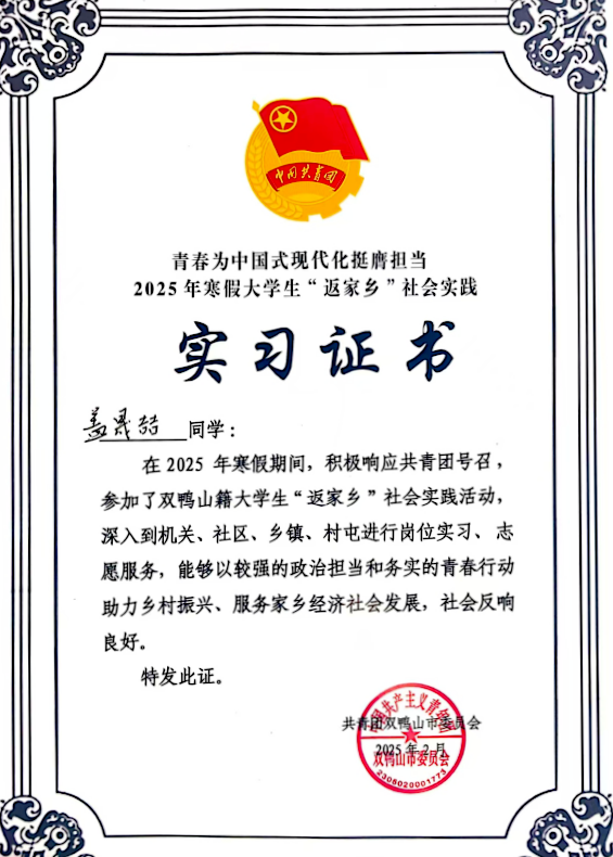 为积极响应共青团中央“返家乡”社会实践活动号召,学校信息工程系学生盖晟喆在共青团双鸭山市委员会的指导下,深入基层,服务家乡,积极参与双鸭山市“返家乡”政务实习活动,用实际行动为家乡发展贡献力量。