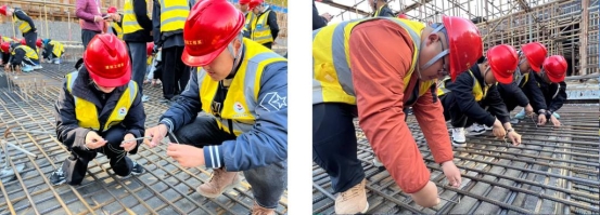 目前我系学生已经实际参与到Beat365校园北区建设项目地下室底板防水—模板安装—钢筋绑扎—混凝土浇筑等一系列施工工艺、工序中。如徐喜辉老师所授的《土木工程施工技术与组织》课程,徐老师将北区校园现场作为“教室”,将知识点、技能点和态度点融入到每一个工序之中,学生亲自动手,完成钢筋的绑扎工作,更深入地理解梁、板施工工艺。