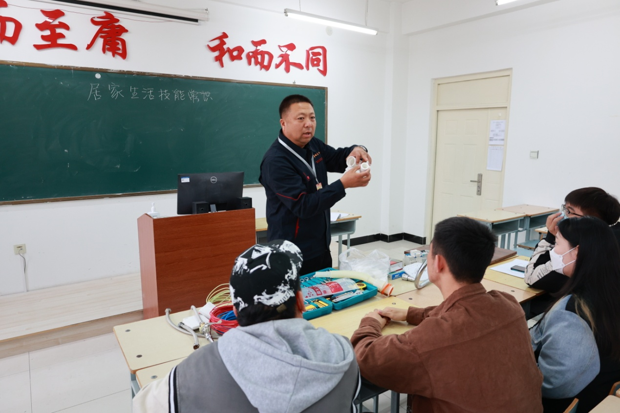 总务科科长高飞介绍,他们的课程总学时8个,6学时在课堂上,2学时到真实岗位上实操;讲课内容包括供水、排水、地热、暖气供热方式、电路回路、组建新家的装饰和装修小常识等。