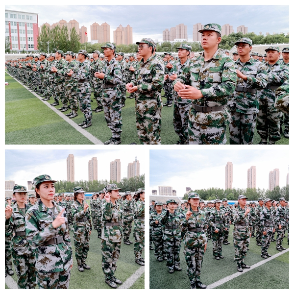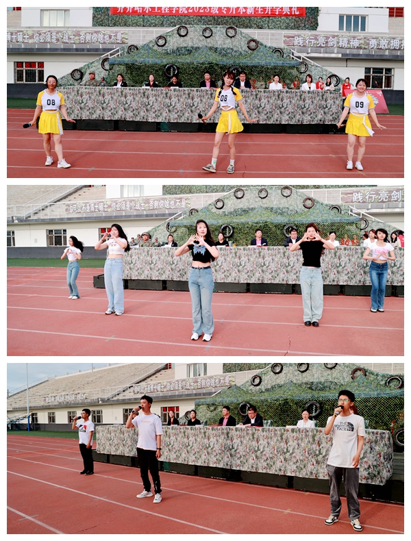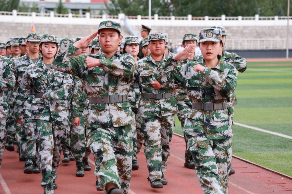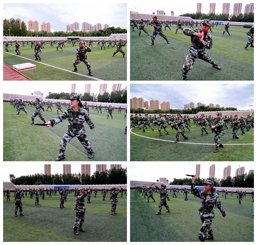 在学长教官团团长孙志屹的指挥下,全体新生以分列式、军体拳、匕首操等精彩表演,展示军训成果。