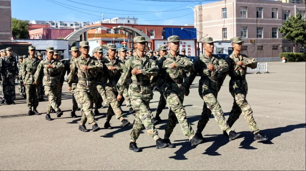 操场上,学长教官团迈着整齐的步伐进入会场,演示训练科目,他们在阳光下挥洒汗水,橄榄绿的迷彩服在阳光下熠熠生辉,展示了齐工程学长教官的风采。