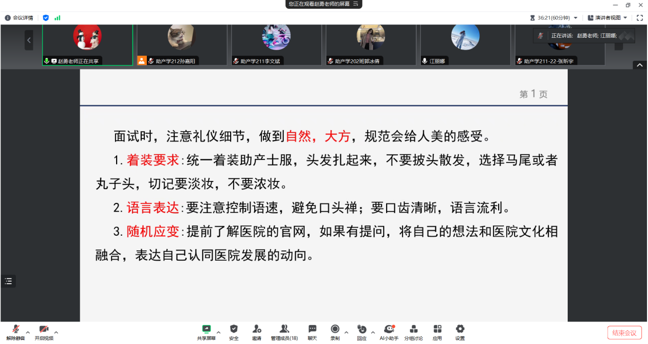 为了能让助产学专业学生能够被航天中心医院优先录用,在面试前一天,健康与护理系助产学专业召开了2021届学生线上就业指导讲座。