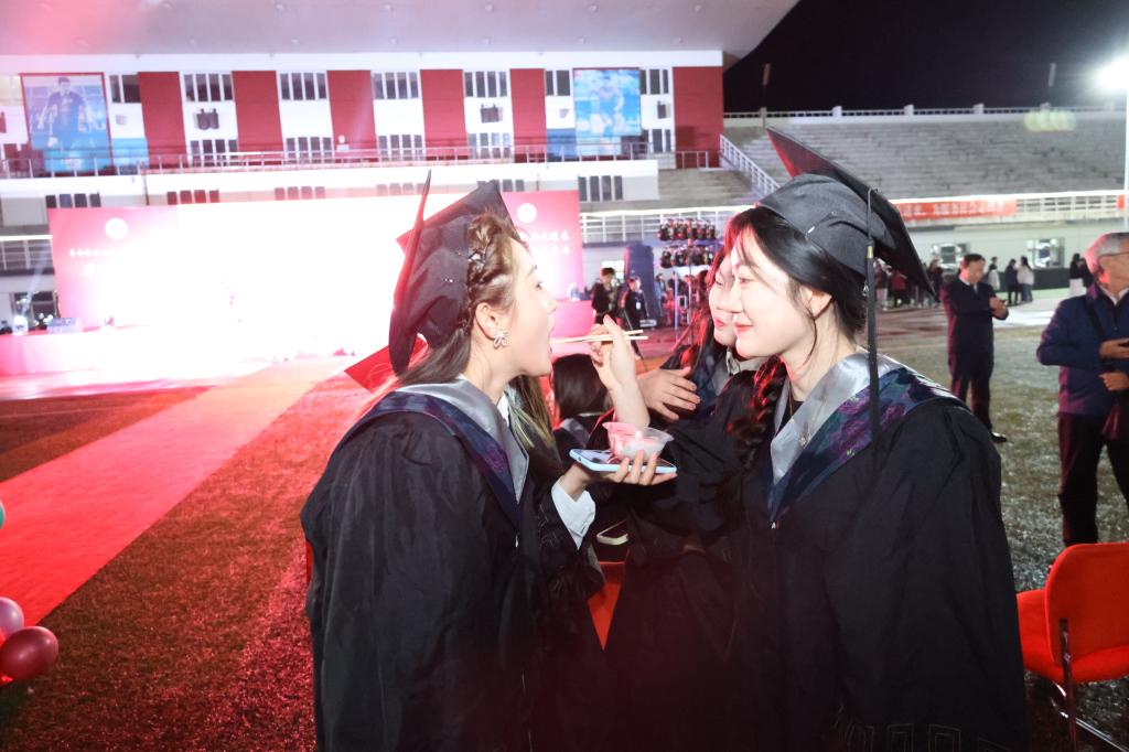 “上饺子喽”,伴随欢快的音乐,一碗碗包含着学弟学妹浓浓的祝福的热气腾腾的饺子送到在场每一位毕业生手里,夜空里礼花绽放,映照着每一张幸福的笑脸。