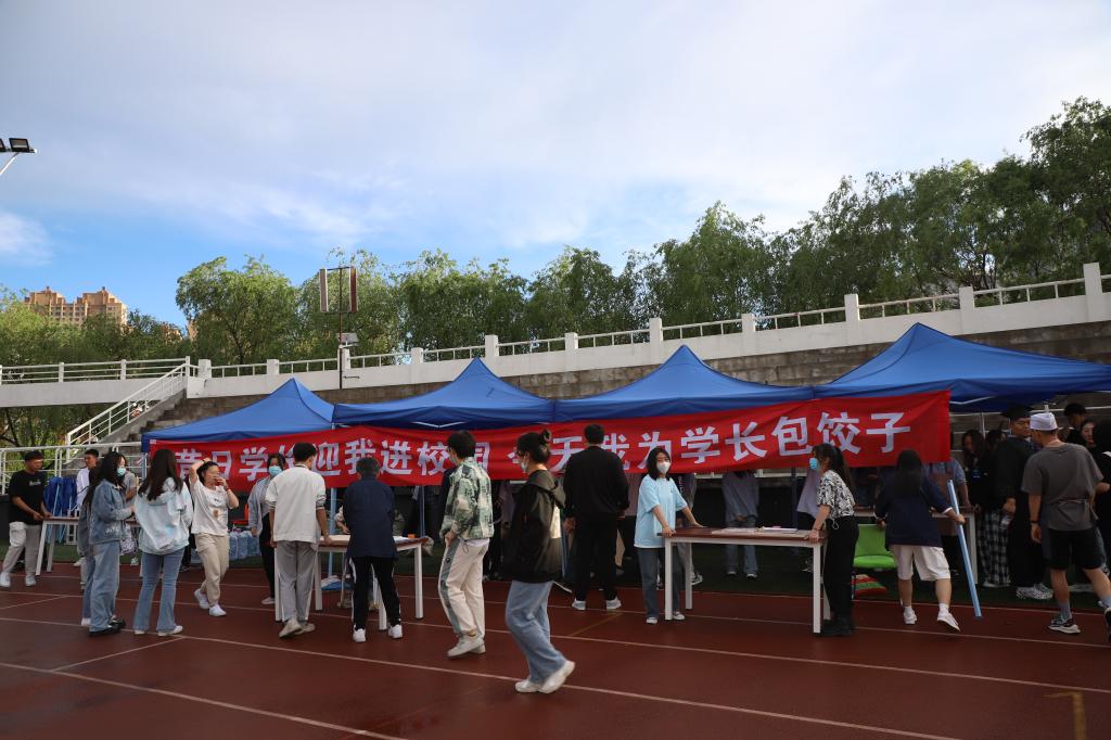 场内激情满满,场外热气腾腾,在校生为学长包饺子的环节悄悄进行。体育场西侧一排临时搭建的折叠房前,近百名学弟学妹戴着厨师帽围着白围裙,既有分工又有合作,包着猪肉葱花与酸菜肉馅的饺子为学长送行。“昔日学长迎我进校园,今天我为学长包饺子”的条幅在夜色中,格外显目,格外暖心。