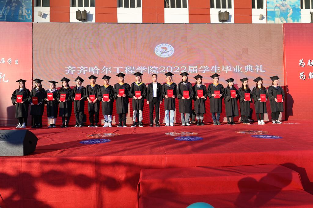 2022届毕业生代表向学校赠送锦旗和鲜花,工会主席、总会计师姜岩与副院长白雪代表学校与毕业生代表合影留念。