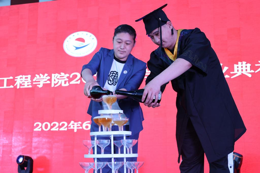 典礼上,生涯导师代表与学生共同斟满香槟塔,此刻彩烟腾空升起,表达了对学校对毕业生们的美好祝愿。