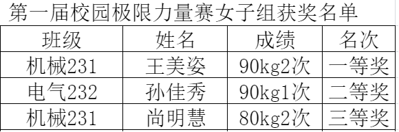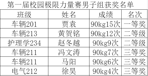 比赛中,选手们热情高涨,积极参与,奋力挑战自身的力量极限。最终,车辆201班贾袁、机械231班王美姿分别获得男女组一等奖,车辆213班黄贺铭等7名学生分获二等奖和三等奖。