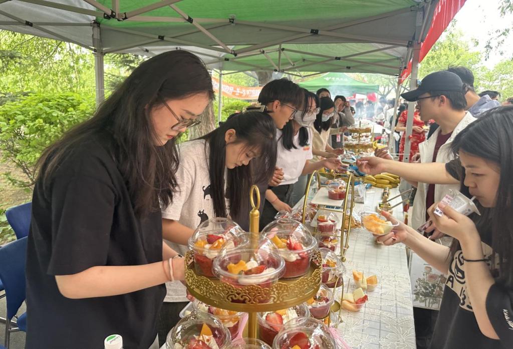 康护工程系为毕业生们准备了果盘、草莓蛋糕、酸奶及各样小零食。摊位上弥漫了奶油和水果的香气,令人垂涎欲滴。
