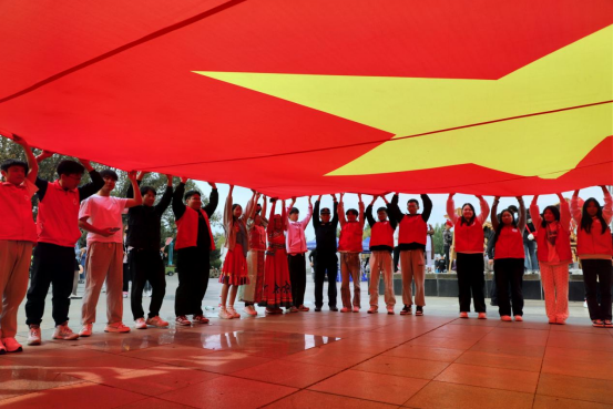 为庆祝中华人民共和国成立75周年,弘扬爱国主义精神,激发广大青年的爱党爱国热情,9月28日上午,团市委组织全市共青团各战线青少年共同开展“红领巾爱祖国新青年耀未来”大手拉小手活动,学校团委、大学生艺术团、学长教官团、大学生青年志愿者协会共100余人参加。