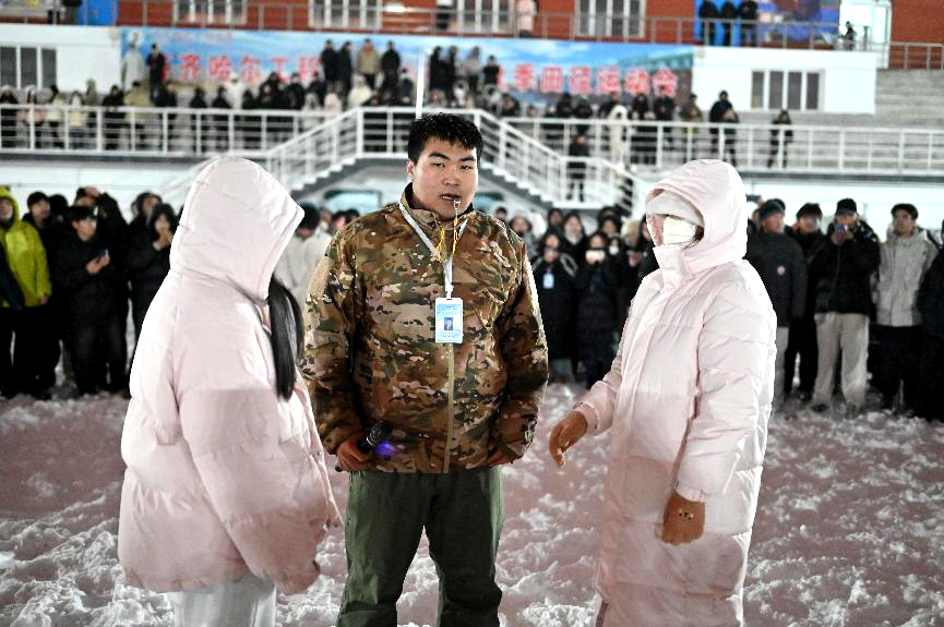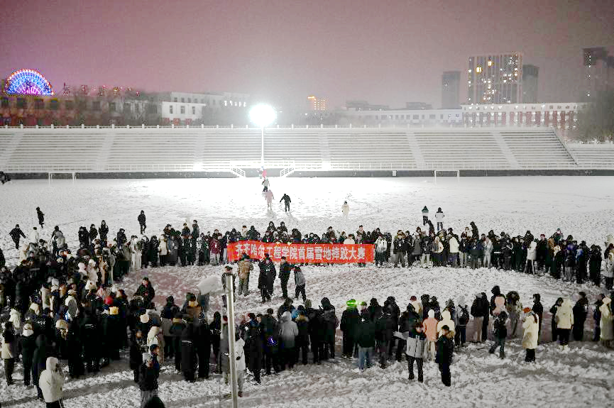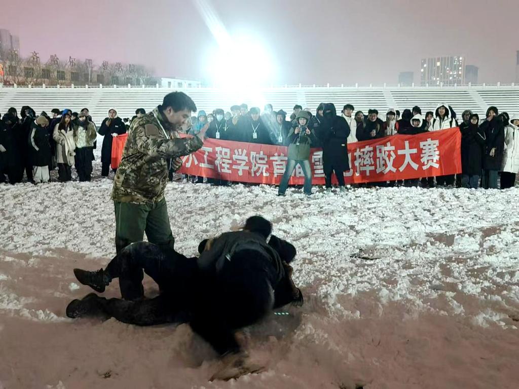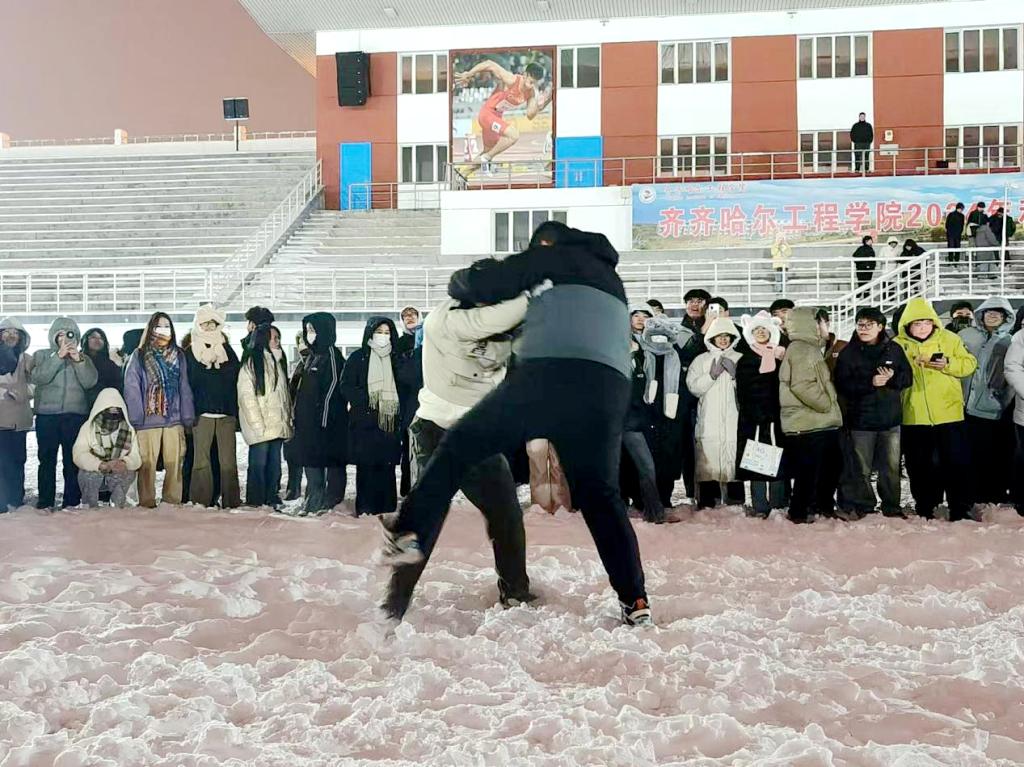 近日,学校在体育场举办首届雪地摔跤大赛。