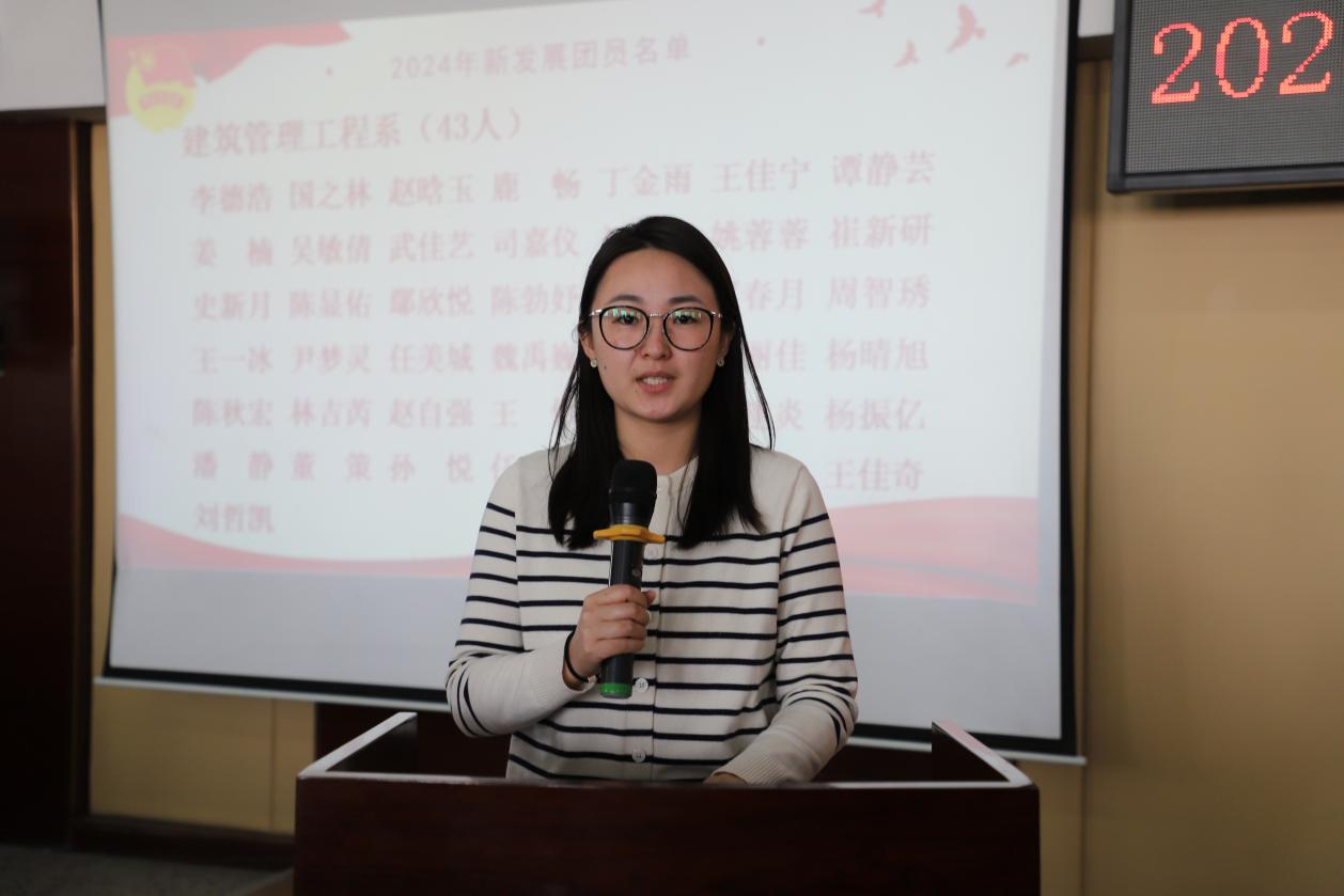 建筑管理工程系财管223班董策作为新团员代表发言。他表示,作为团组织的一员,将面对新的挑战,肩负新的责任,要以更高的标准严格要求自己,为团组织增光添彩。