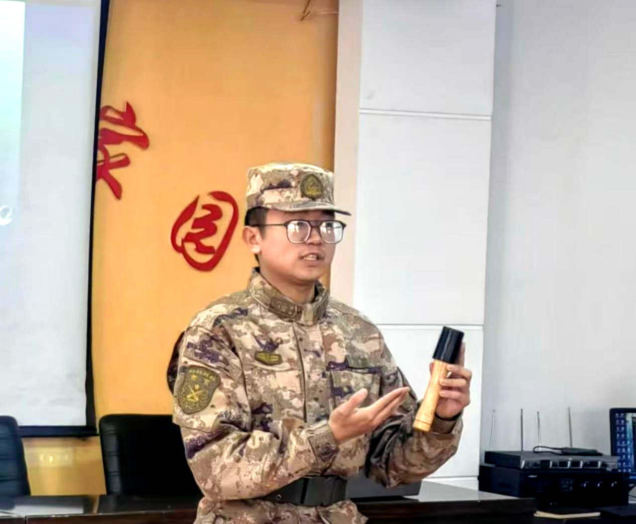 随后,学长教官信息工程系电商232常乐对军事器械进行了讲解介绍,让居民对国防装备有了更深入了解,并通过生动有趣的互动游戏,让居民在参与中学习到国家安全、军事战略、国防科技等方面的基本知识。团学骨干们利用展板、宣传册等形式,展示了我国国防建设的成就和军人风采。机电工程系车辆243郑美美同学从“新时代爱国主义精神”“做新时代青年”等方面讲解爱国主义的深刻内涵和重要意义。