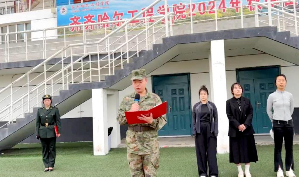 学长教官代表、机电学院新能源241王博发言。他深刻阐述了诚信对于学业发展的重要性,倡议全体同学自觉坚守诚信底线,以端正态度积极备考,以真实成绩检验学习成果,展现齐工程学子的优良学风。