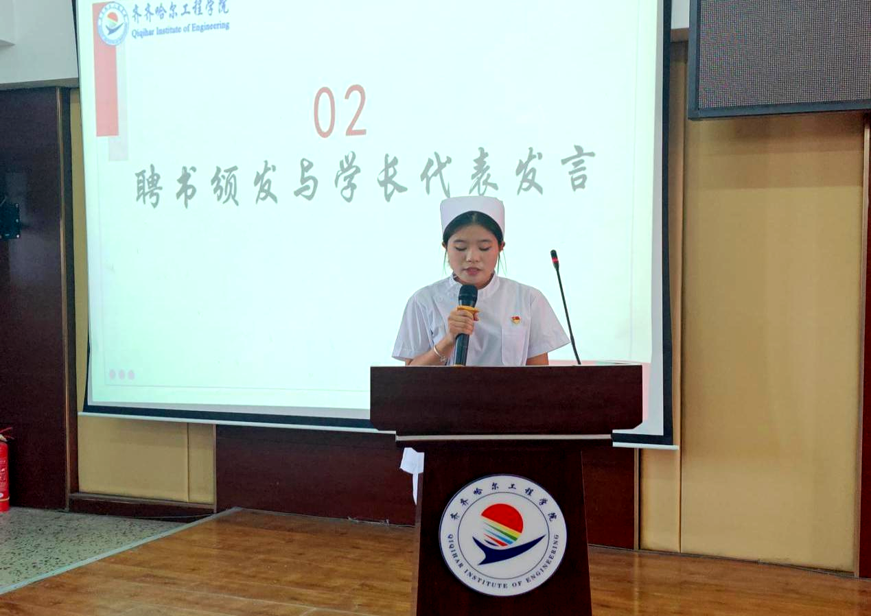 医学院护理学(专升本二年制)246班的贾宏莹作为学长代表上台发言。她分享了作为学长的认知与感悟,表达了对履行学长职责的坚定决心,并以积极的态度投入校园服务工作。