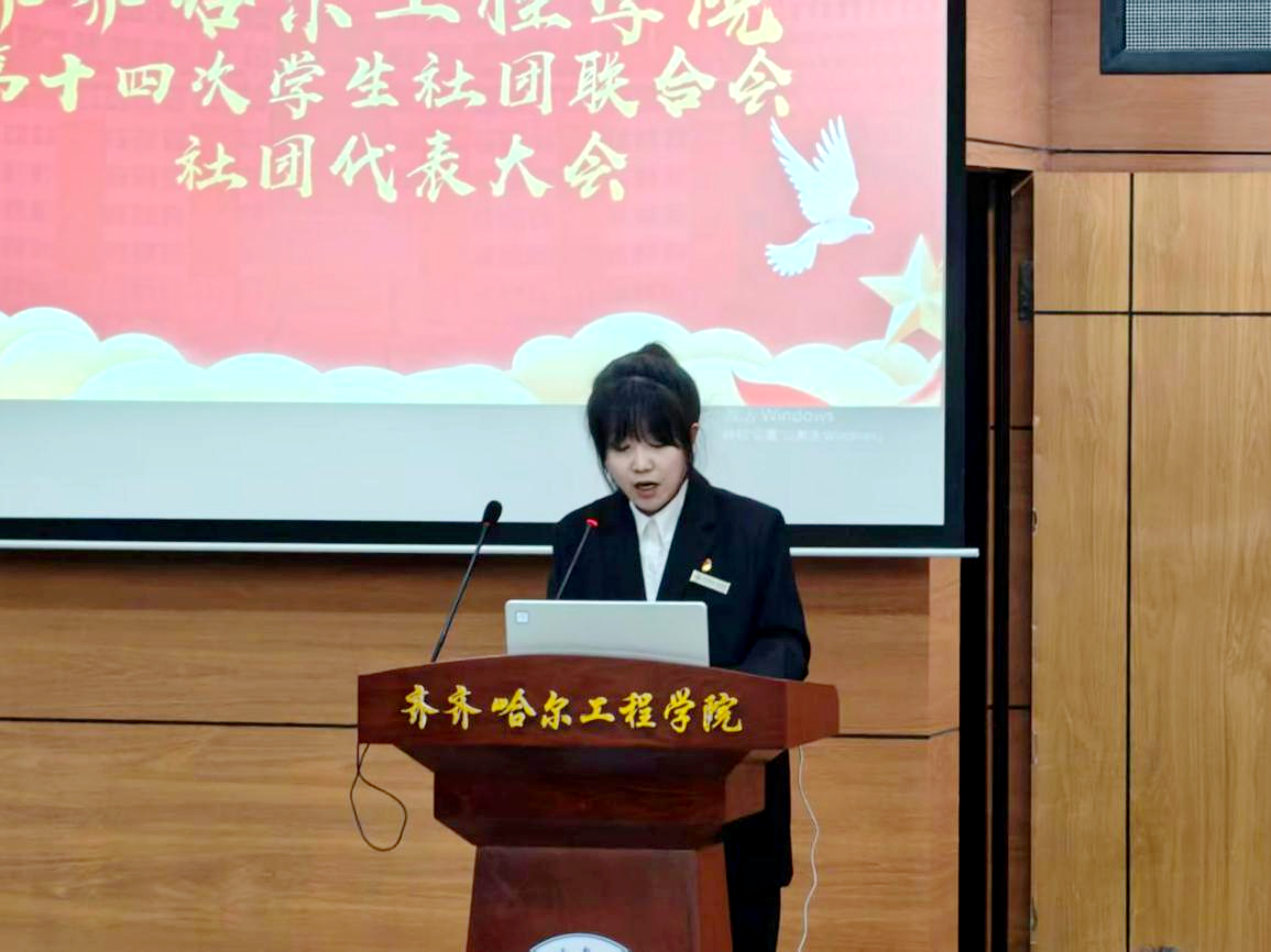 第十四届学生社团联合会主席于嘉发言,她向新当选的学生社团联合会委员表示热烈祝贺,希望新一届委员不忘初心、砥砺前行,秉承“勤思慎行,博才多艺”的宗旨,传承优良作风,聚焦发展痛点,优化管理机制,加强社团联动,坚守服务初心,推动学校学生社团工作再上新台阶,再创辉煌。