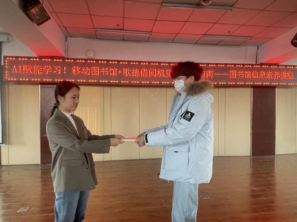 互动问答环节气氛热烈,同学们踊跃举手,争先恐后地回答问题,并围绕移动图书馆资源检索、AI功能实操、使用过程中遇到的疑问展开深入交流。崔圣男耐心细致地逐一解答,对回答准确的同学颁发纪念品,极大地激发了大家的参与热情。
