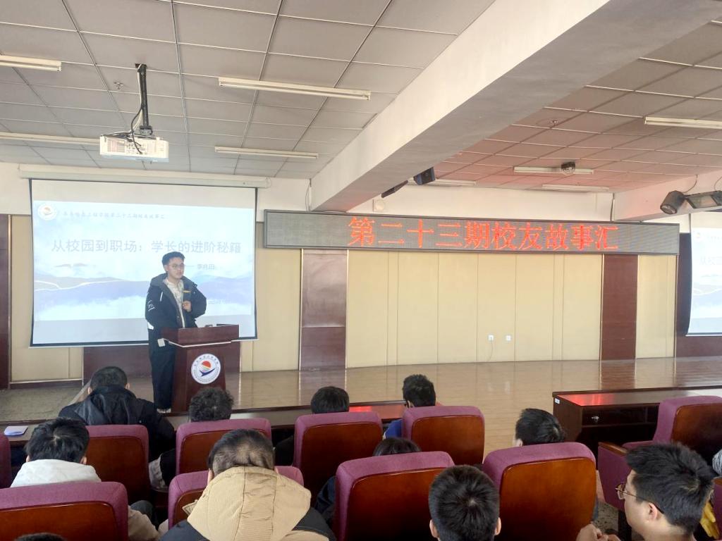 12月2日,在图书馆501会议室,学校举办第二十三期校友故事汇活动。建筑管理工程系土木工程专业邀请2024届优秀毕业生李兆田返校,为学校大三、大四学生作“从校园到职场——学长的进阶秘籍”交流分享,学生发展中心教师何龙主持。