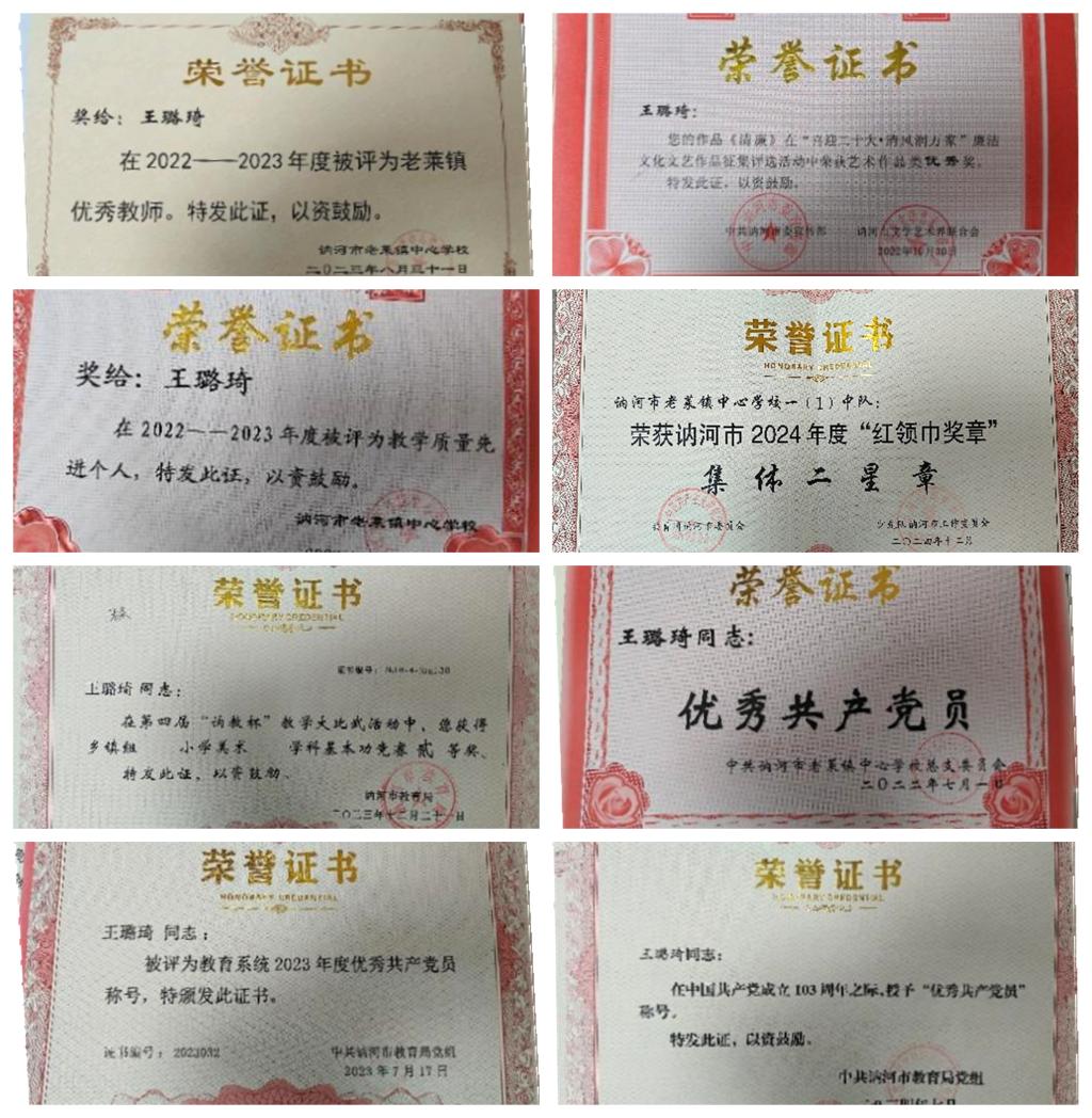 毕业后,王璐琦通过系统备考,考取了美术教师资格证与特岗教师考试,并于2021年8月入职讷河市老莱镇中心学校,成为一名特岗美术教师。她将视觉传达设计专业的视觉符号逻辑、色彩心理学等知识融入教学实践,在教师基本功大赛中屡创佳绩,2022年讷河市“中小学教师美术基本功大赛”中获得优秀奖。2023年第三十六届黑龙江省青少年科技创新大赛中,她指导学生进一步研究创新形式,课堂上手把手教学生用拓印技法将植物形态转化为装饰图案,获得少年儿童科学幻想绘画竞赛二等奖,其课程设计被收录为讷河市美术教研组参考案例。在第四届“讷教杯”教学大比武活动中,获得乡镇组小学美术学科基本功竞赛二等奖。她凭借扎实的专业素养和教育情怀,在2022—2023年度被评为老莱镇优秀教师荣誉称号。