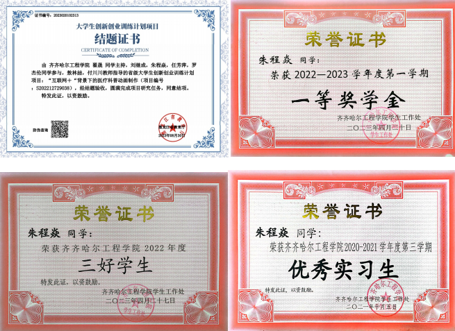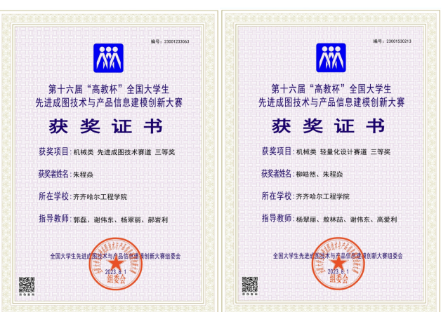 朱程焱更善于在竞赛中锤炼本领。他积极投身各类专业赛事,在“第十六届高教杯全国大学生先进成图技术与产品信息建模创新大赛”中,一举拿下团体二等奖、先进成图技术赛道三等奖、轻量化设计赛道团队三等奖;在“第十四届黑龙江省‘龙江杯’先进成图技术与产品信息建模创新大赛”中斩获三等奖;在“黑龙江省大学生创新创业训练计划项目”中立项。这些竞赛经历不仅让他熟练掌握了机械制图、产品建模等核心技能,更培养了他的团队协作与创新思维。从教室到赛场,从学生干部到竞赛能手,朱程焱以“勤学、善思、笃行”的态度,在机械设计制造及其自动化专业的领域里不断深耕,为职业发展打下了坚实基础。
