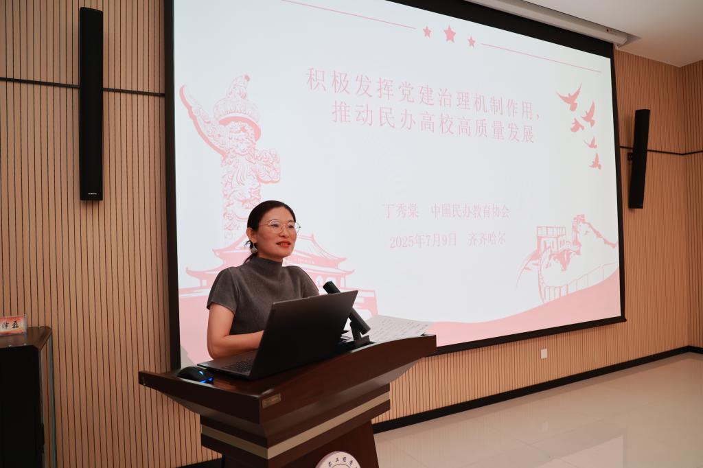 中国民办教育协会副秘书长丁秀棠以“积极发挥党建治理机制作用,推动民办高校高质量发展”为题从“一融双高”新要求、党建引领到党建治理、党建治理机制探析、提升党建治理效果四个方面进行分享,她指出,通过建立健全党建治理机制,不仅提升党的治理效能,更能为学校高质量发展提供坚强保障。要深刻把握其内涵实质,切实将其转化为推动学校发展的强大动力。