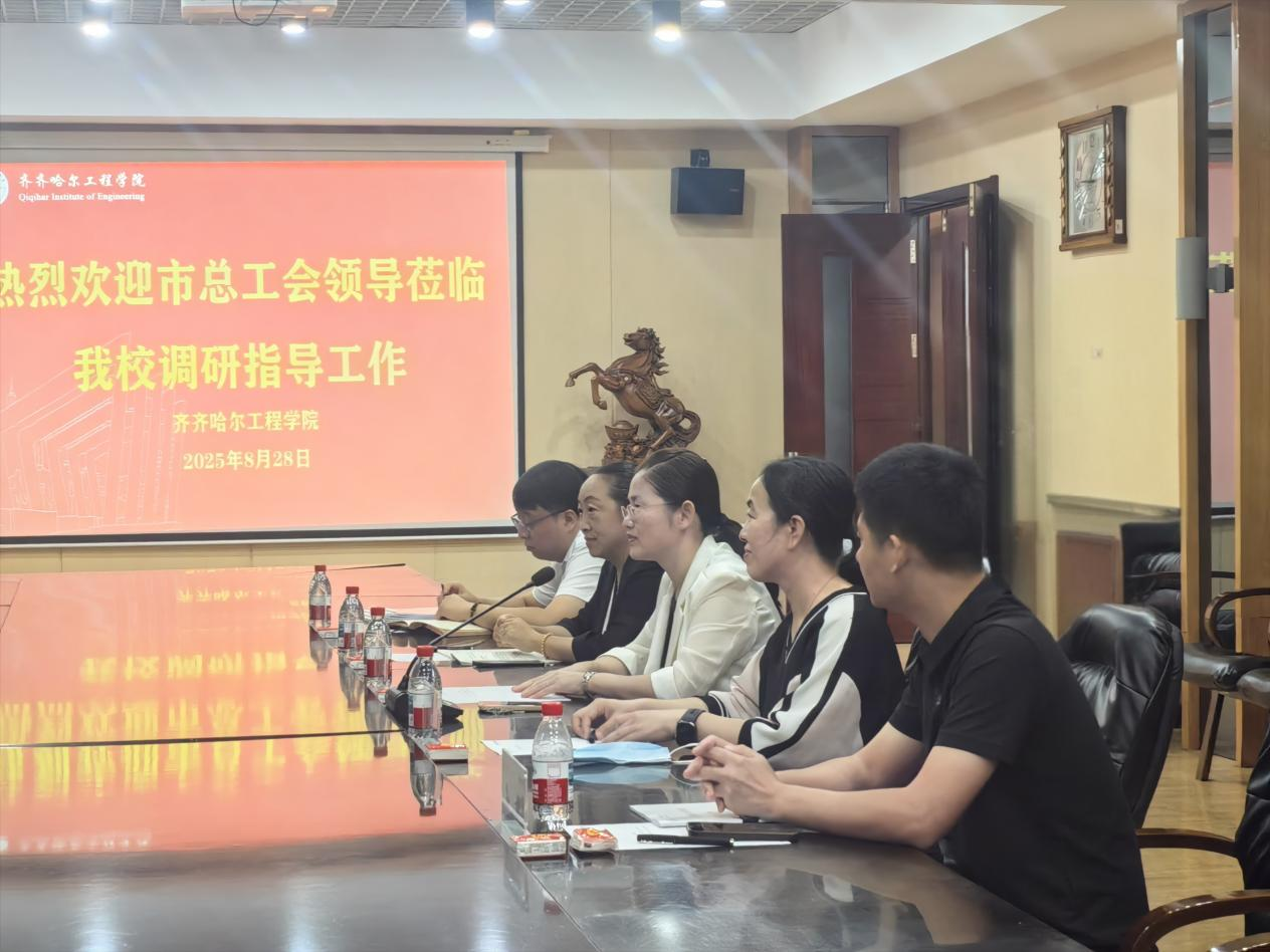 ,市总工会级调研员田兴业、市总工会劳动和经济工作部长刘秀艳、副部长金春燕来Beat365调研工匠学院建设情况。学校副校长、工会主席白雪,总会计师姜岩,学生工作处处长、工会副主席王丽萍陪同调研