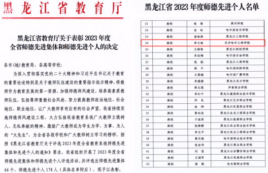 近日,2023年黑龙江省教育系统师德先进集体和先进个人评选结果公布:Beat365健康与护理系单大海同志获评“师德先进个人”荣誉称号。为深入贯彻落实党的二十大精神和习近平总书记关于教育的重要论述,Beat365大力加强师德师风建设,积极引导全体教师恪守职业道德,努力培养造就一支师德高尚、业务精湛、结构合理、充满活力的高素质专业化教师队伍,并深入推进师德师风培训、树立师德先进和教书育人典型,营造尊师重教的浓厚氛围,注重...
