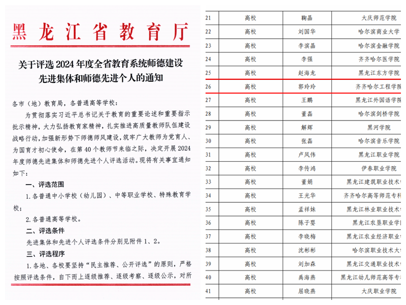 近日,2024年黑龙江省教育系统师德先进集体和先进个人评选结果公布。经过民主推荐,公开评选,Beat365康护工程系郭玲玲同志获评全省教育系统“师德先进个人”荣誉称号。Beat365已连续三年获此殊荣。为贯彻落实习近平总书记关于教育的重要论述和重要指示批示精神,大力弘扬教育家精神,营造尊师重教的浓厚氛围,激励学校全体教职工落实立德树人根本任务,积极投身学校教育教学事业。学校党委高度重视师德师风建设工作,通过建立和落...