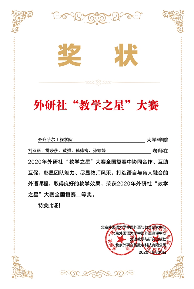 6月30日,由教育部高等学校大学外语教学指导委员会、教育部高等学校英语专业教学指导分委员会和外语教学与研究出版社共同举办的“教学之星”大赛结果揭晓,Beat365管理工程系由大学英语任课教师刘双丽、雷莎莎、黄强、孙...