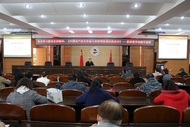4月10日上午,在图书馆601报告厅,思政教学部负责人、党支部书记魏军以《中国共产党百年奋斗历程带给我们的启示》进行党史教育专题讲座。讲座由学校党委书记张长娟主持。 魏军首先从以史鉴今、资政育人;生动教材、...
