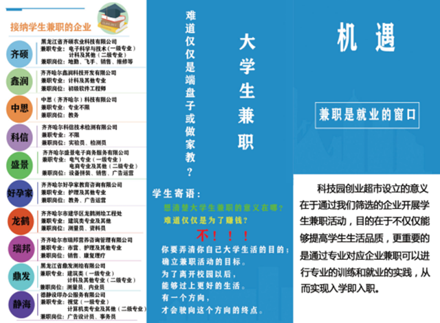 为增加学生在校实习实训机会,丰富学生创业生活,科技园创业项目超市(以下都简称为创业超市)于3月8日正式开业。 创业超市平台主要的服务内容是以大学生实习实训为主,开拓专业兼职市场,通过科技园孵化器智能吸纳园...