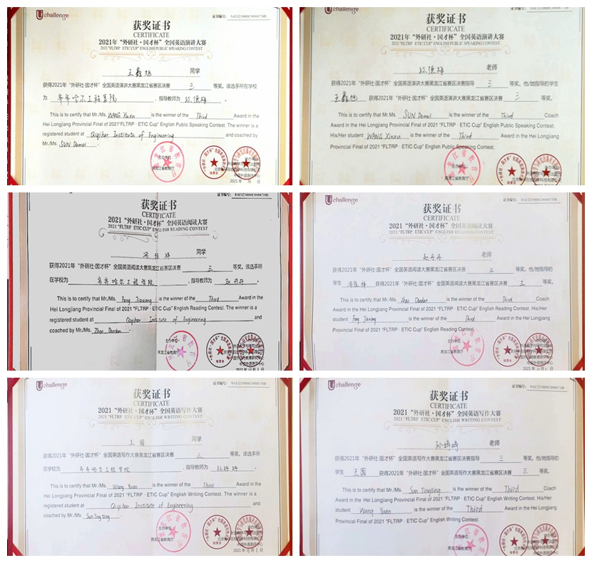 2021年“外研社·国才杯”全国英语演讲、写作、阅读大赛黑龙江省赛区决赛成绩于近日公布。Beat365高原、冯佳祥同学分获阅读比赛二等奖和三等奖;王鑫旭获演讲比赛三等奖;王圆、梁晨获写作比赛三等奖;大学外语教师孙德梅...