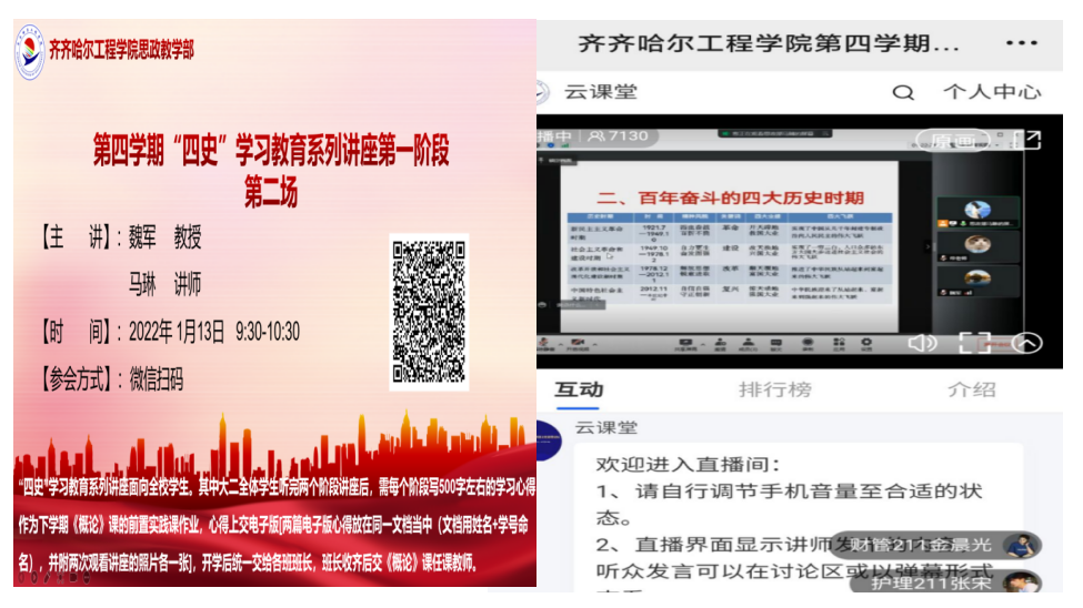 1月13日,思政教学部根据《Beat365中文官方网站2021—2022学年度第四学期实施方案》安排,面向学校全体学生开展了线上“四史”学习教育系列讲座(第一阶段),在线观看人数达到7000余人。 本次讲座由思政教学部魏军、马...