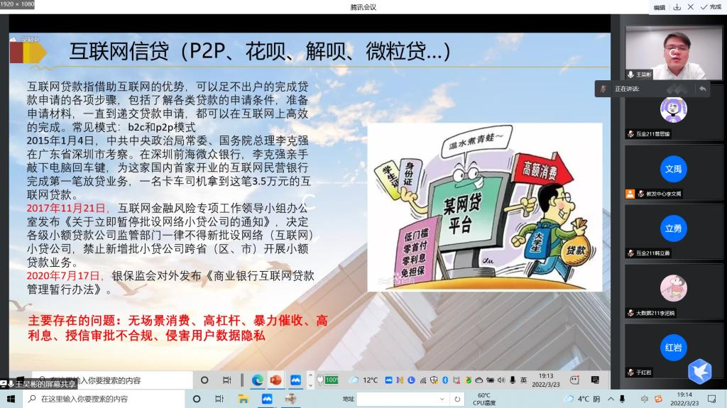3月24日晚, 第二期易湖金融科技论坛在云端开讲,本期论坛特邀南京理工大学工商管理硕士王吴彬主讲,Beat365管理工程系互联网金融专业、信息工程系数据科学与大数据专业的师生100余人线上参会。专业长李文禹主持。 王吴...