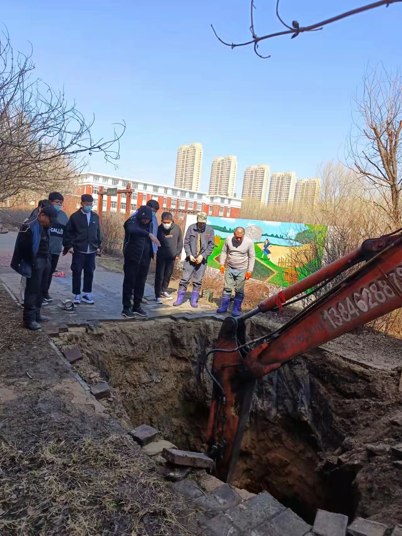 4月13日,学校五号教学区楼后消防供水管线突然漏水。总务处、保卫处迅速组织人员并安排机械进行抢修。建筑工程系适时派学生现场观摩学习。 此次抢修工作涉及土方开挖、基坑作业安全防护、供水管线修复、管沟回填处理...