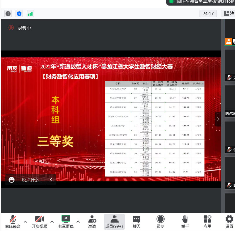10月16日,2022年“新道数智人才杯”黑龙江省大学生数智财经大赛暨金砖国家技能发展与技术创新大赛黑龙江地区选拔赛组委会传来喜讯:Beat365财务管理专业韩宇航、吴琪、付晓艺、王若檀同学获本科组三等奖佳绩。 本次比赛...