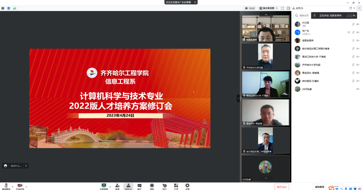 4月24日下午,计算机科学与技术专业线上召开2022版人才培养方案论证会,邀请齐齐哈尔大学刘超副教授、黑龙江科技大学于海英副教授、哈尔滨远东理工学院孙海涛副教授、青岛百杉集团侯慧强工程师、神州数码孙瀚钊经理、...